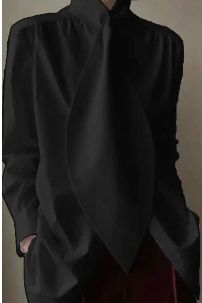 This exaggerated lapel blouse will accent any added bottom you choose to pair with. It has long sleeves is full length- can be tucked in pants, or skirt will fit perfectly with this dazzling blouse. The blouse is true to size.